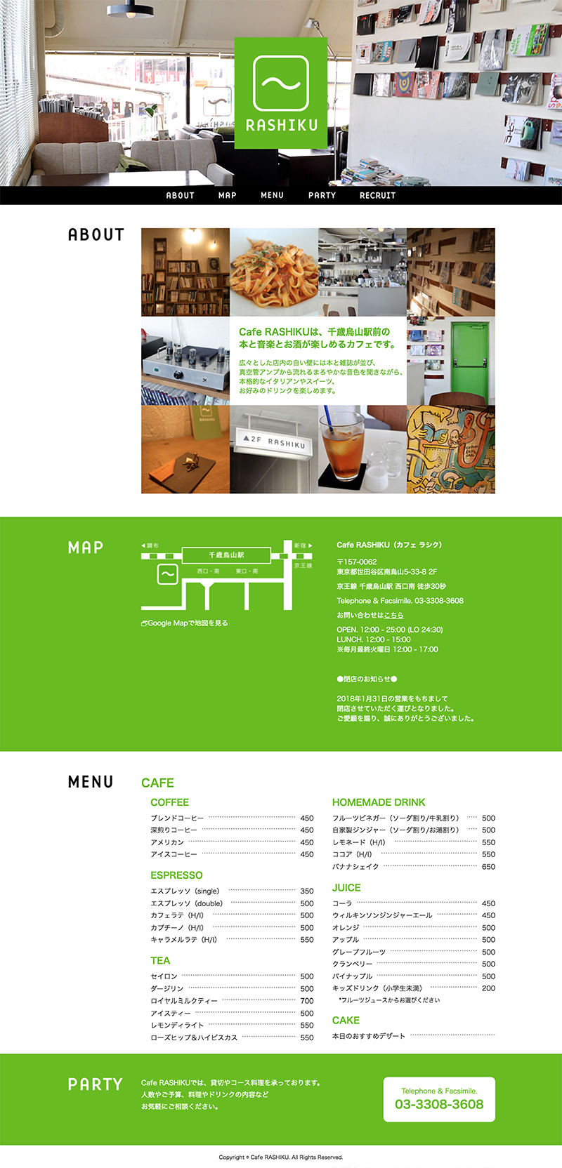 千歳烏山のカフェ「Cafe RASHIKU」のwebサイトのデザイン、HTML・CSSの構築を担当しました。