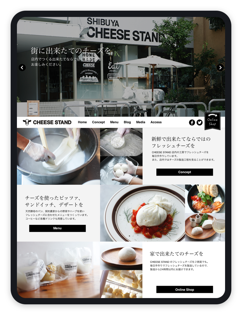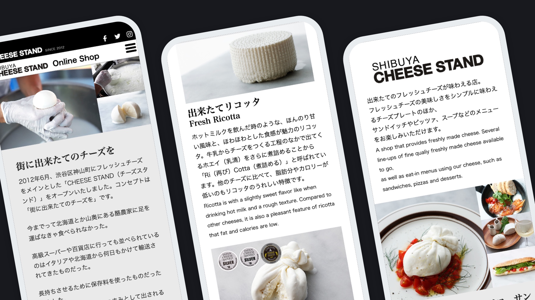 2012年6月、奥渋谷にオープンした「CHEESE STAND」。webサイトのデザイン・WordPress構築・更新をオープンから2018年まで担当。2店舗目がオープンした2015年にはwebサイトのリニューアルも実施しました。