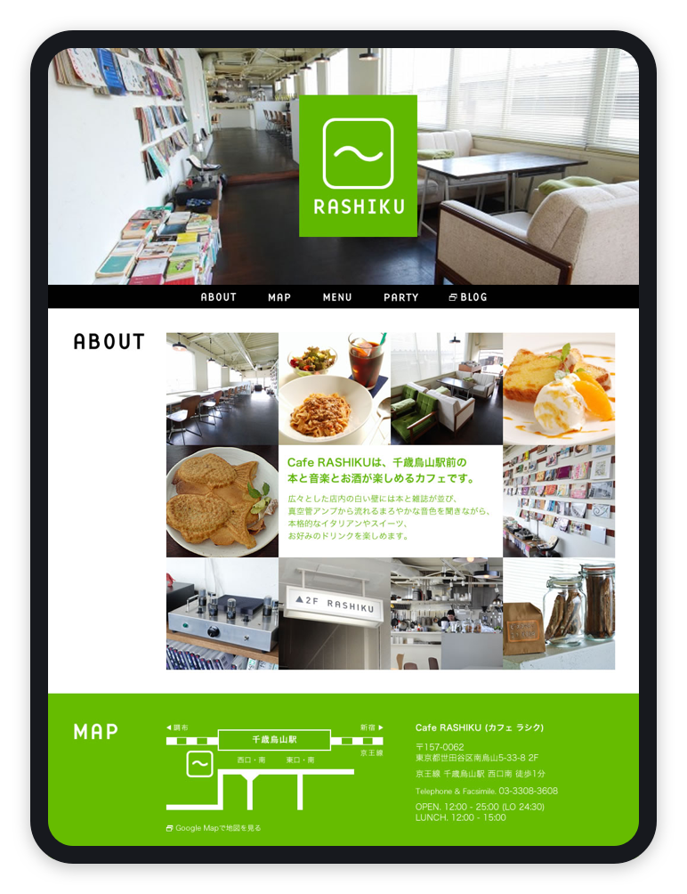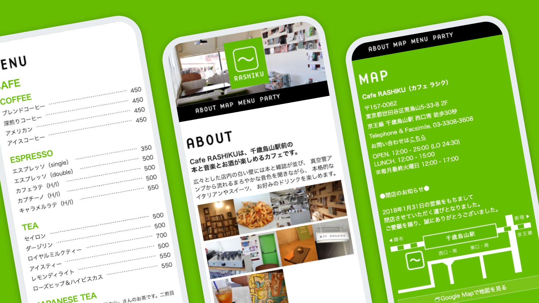 千歳烏山のカフェ「Cafe RASHIKU」のwebサイトのデザイン、HTML・CSSの構築を担当しました。